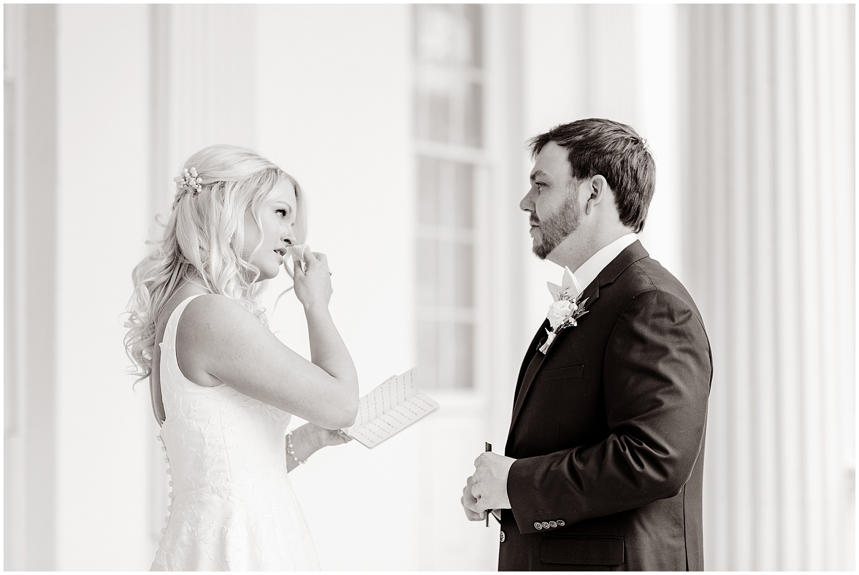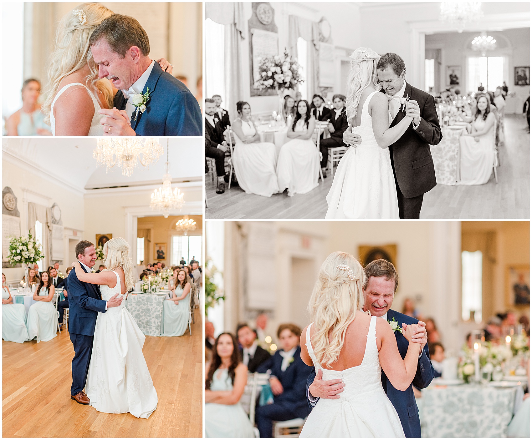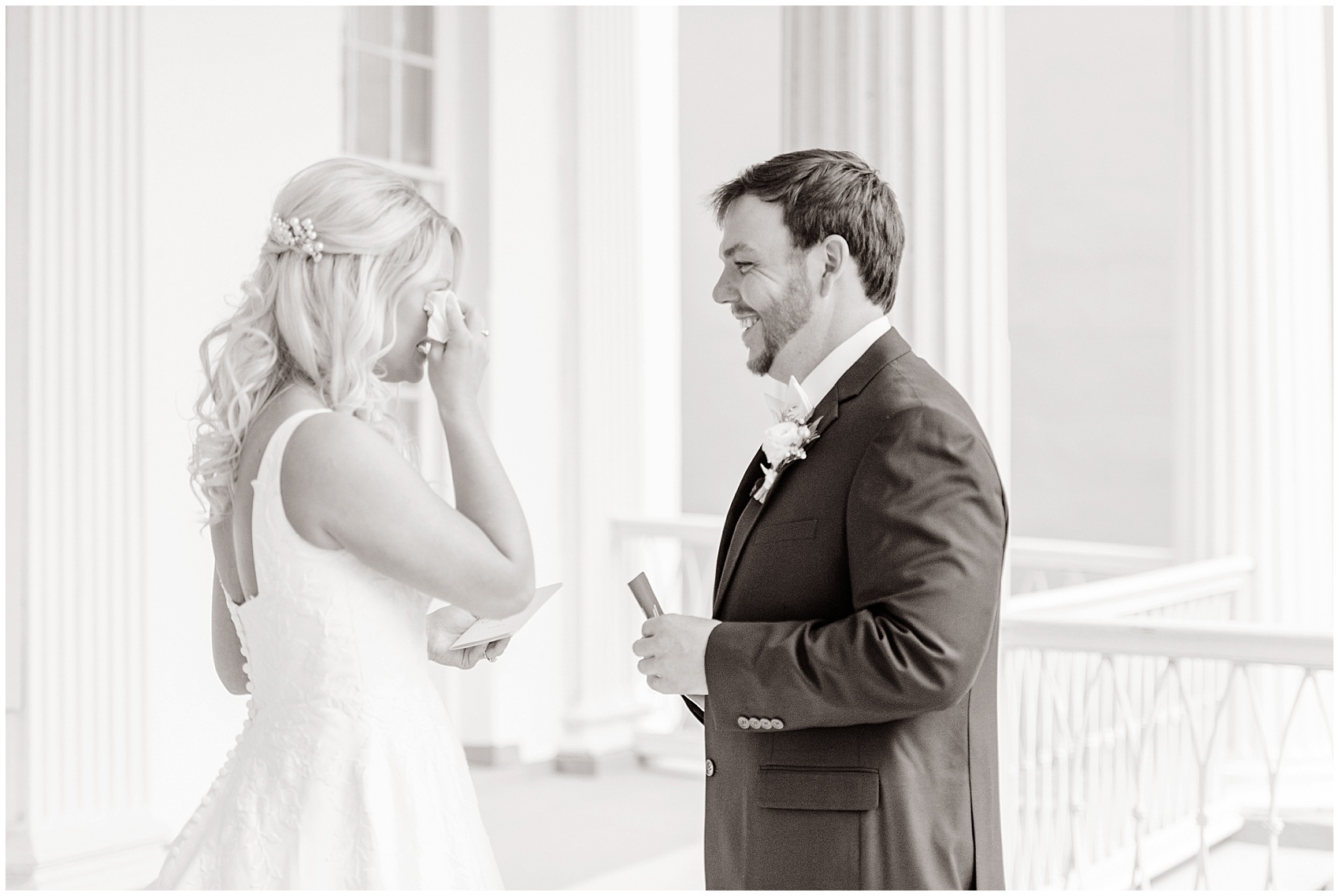 She walked out the door onto the second floor balcony, holding her gown in her hands. Her face was all smiles as she glanced over at Jameison facing the street, anxiously waiting to turn around. As they finally shared their first look on their wedding day, they went from giant smiles to happy tears and back again. This was just the start of the happy tears on this day. Emma’s father wept all the way down the aisle as he gave his daughter away. When they shared their father daughter dance later, there was barely a dry eye in the place.